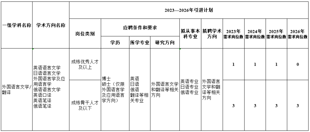 我院英语语言文学、俄语语言文学、日语语言文学和外国语言学及应用语言学学科均有招聘需求。鉴于学科及专业发展需要,翻译方向的应聘者优先考虑。业绩符合高层次岗位要求的应聘者,经学院考察和学校审核、评定后,按高层次岗位人才聘任。